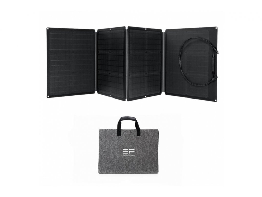 Solární panel - vysoce efektivní monokrystalické křemíkové články, výkon 110 W, voděodolné, skladné a polohovatelné. Se solárním panelem EcoFlow o výkonu 110 W nemusíte mít obavy z míst, kde není elektrická zásuvka. Panel se vyznačuje vysokou efektivitou a díky účinným monokrystalickým křemíkovým článkům pohodlně dobijete bateriové stanice EcoFlow.