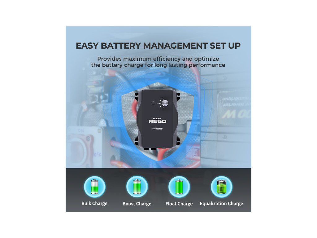 - Bluetooth vám umožňuje sledovať regulátor nabíjania REGO na vašom smartfóne pomocou aplikácie Renogy DC Home