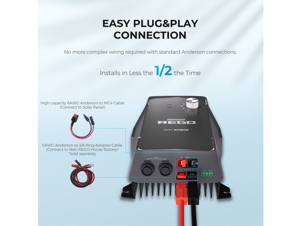 - Anderson kábel na MC4 adaptér, umožňuje jednoduché a ľahké pripojenie regulátora k vašim solárnym panelom, čím skracuje dobu inštalácie o 60%