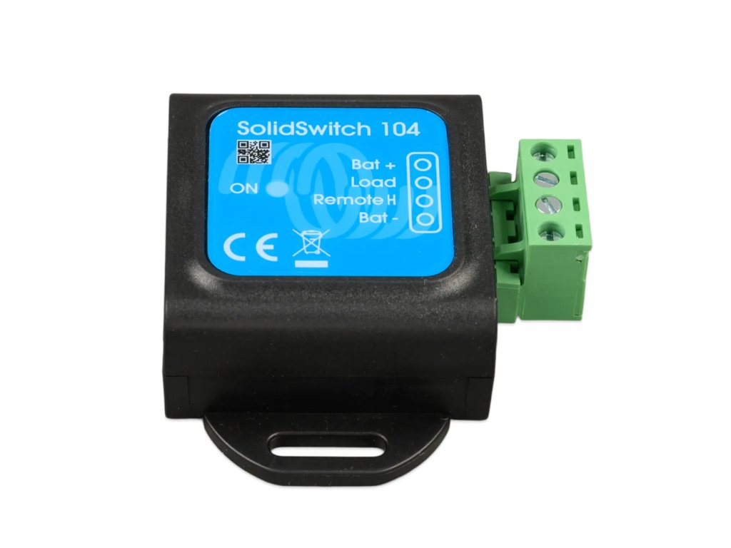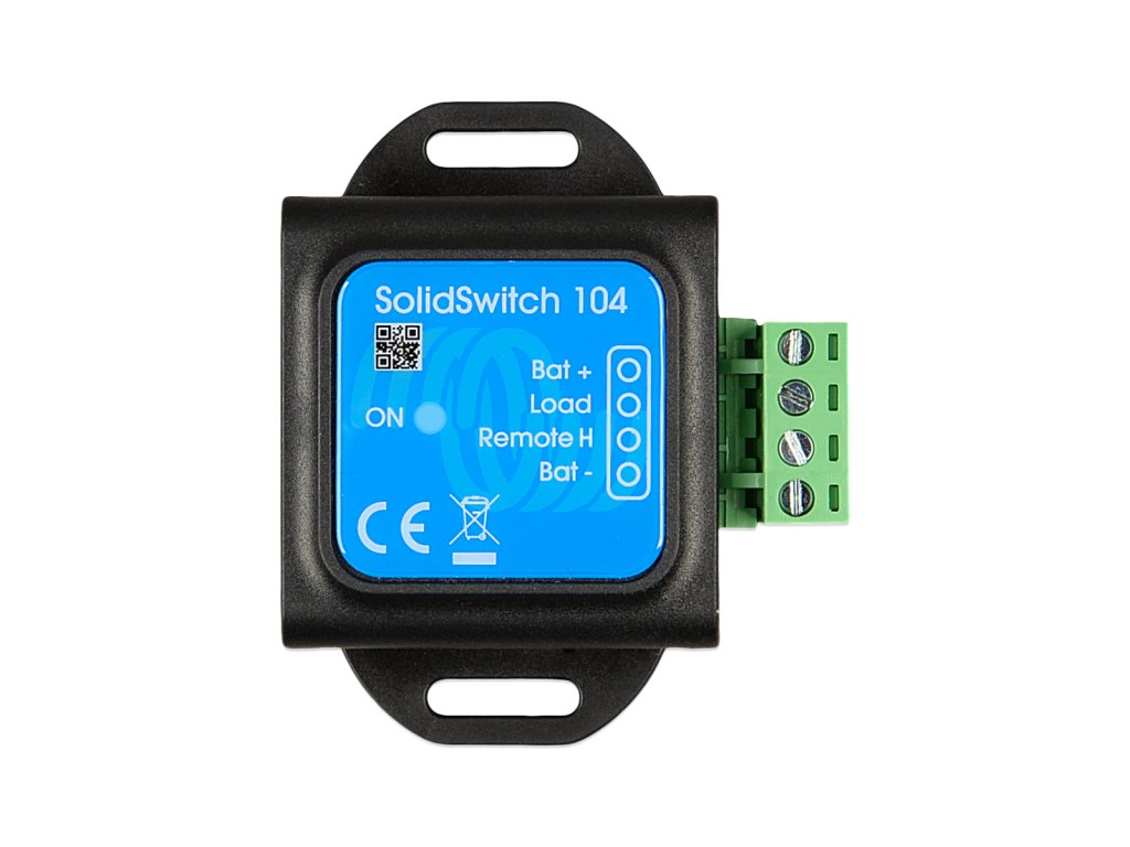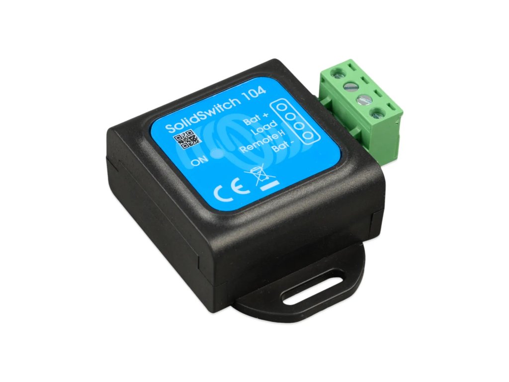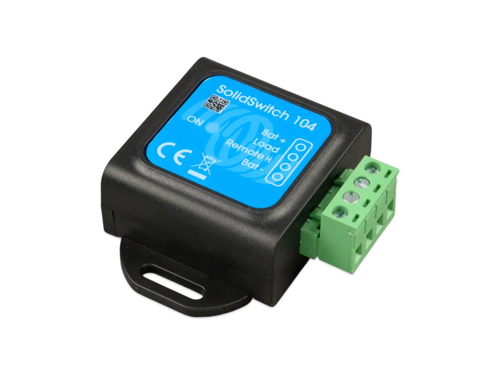 SolidSwitch 104 je polovodičový DC spínač určený pro spínání stejnosměrných zátěží až do 70 V a 4 A. Ovládá se nízkovýkonovým digitálním signálem, přičemž jeho vlastní spotřeba je velmi nízká. Díky tomu je vhodný zejména pro použití v lithiových systémech, kde je klíčové minimalizovat klidový odběr energie.Zařízení je navrženo pro integraci do systémů Victron Energy a nachází uplatnění například při řízení externího regulátoru alternátoru nebo při rozšíření počtu nabíječek připojených k výstupu ATC (allow-to-charge) systému BMS.Hlavní vlastnosti a funkceSpínání DC zátěží až 70 V / 4 AUrčeno pro odporové, kapacitní i indukční zátěže (např. cívky výkonových stykačů).Velmi nízká vlastní spotřebaSpotřeba přibližně 0,04 Ah za měsíc, což výrazně snižuje parazitní zatížení bateriového systému ve srovnání s klasickým relé.Tři typické aplikace použití Řízení externího regulátoru alternátoru (např. v lithiovém systému Victron). Spínání DC zátěže (např. osvětlení) pomocí nízkovýkonového řídicího obvodu. Rozšíření počtu nabíječek připojených na ATC výstup Victron BMS.Nízký ovládací proudMinimální vstupní proud pro sepnutí je 30 µA.Vhodné pro použití s BMSPři trvale aktivním výstupu ATC zůstává zařízení aktivní s minimálním odběrem, což omezuje vybíjení baterií. Technické parametry: Provozní vstupní napětí (Vbat): 8–70 V DC Maximální proud zátěže: 4 AMaximální kapacitní zátěž: Vbat do 15 V: 1000 µF 15 V < Vbat < 30 V: 400 µF 30 V < Vbat < 70 V: 50 µFMaximální indukční zátěž: do 1 A: 1000 mH 1 A < I < 2 A: 100 mH nad 2 A: 10 mHRemote vstup (Vin): volně plovoucí nebo Vin < 3 V: výstup vypnut 3,3 V < Vin < 70 V: výstup zapnut minimální vstupní proud pro sepnutí: 30 µA Provozní teplota: -20 až +50 °C Vlhkost: max. 95 % (nekondenzující) Krytí: IP20 Materiál: ABS, matná černá Rozměry (v × š × h): 58 × 66 × 23 mm.